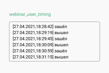 webinar_user_timingдолжна появиться запись с вашим комментарием. - Записи о выходе со страницы вебинара можно проверить таким же способом.