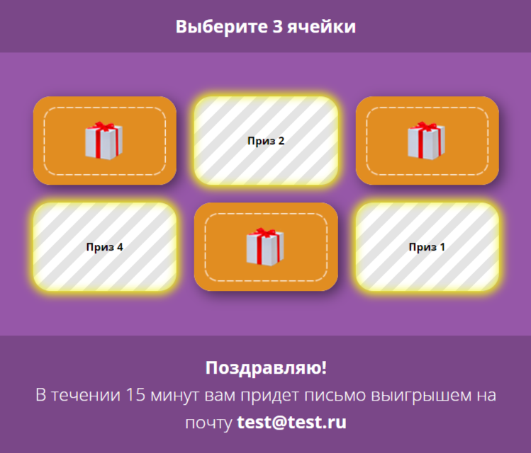 Стоит учесть, что кол-во победителей, конкретного приза может быть больше чем указано в лимите. Такое происходит, если несколько пользователей одновременно находятся на странице. В таком случае есть шанс, что пользователям откроется один и тот же приз.